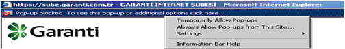 e-Trader adımını tıkladığınızda ayrı bir pencere açılmıyorsa üst menüde “Açılır Pencere Engellendi (Pop-up blocked)” diye bir mesaj görebilirsiniz. Bu mesaja tıklayarak “Bu Siteden Açılır Pencerelere Her Zaman İzin Ver (Always Allow Pop-ups From This Site)” işlemini seçerek e-Trader adımına tıkladığınızda bir daha bu uyarıyı almamayı sağlayabilirsiniz. İnternet Explorer programında bu işlemi yaptığınızda İnternet Şubesi’ne tekrar giriş yapmanız gerekebilir.